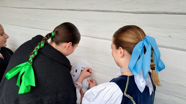 Dievčatá z folklórneho súboru v Liptovskej Tepličke maľujú slamenú figurínu oblečenú do kroja na začiatku aktu vynášania Moreny, ktorým sa tam symbolicky snažia odohnať zimu a privolať jar. Liptovská Teplička, 10. marec 2024. Foto: SITA/Mária Frisová.