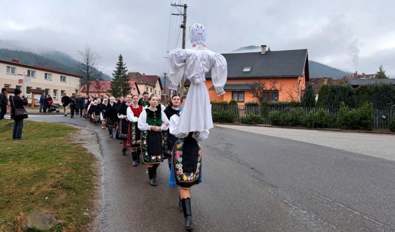 Sprievod podtatranskou obcou Liptovská Teplička počas vynášania Moreny, ktorým sa tam symbolicky snažia odohnať zimu a privolať jar. Liptovská Teplička, 10. marec 2024. Foto: SITA/Mária Frisová.