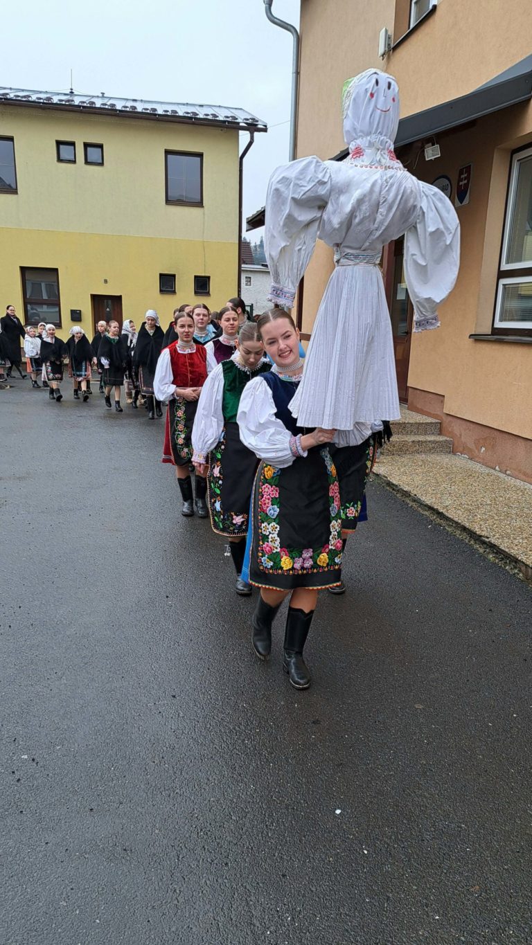 Sprievod podtatranskou obcou Liptovská Teplička počas vynášania Moreny, ktorým sa tam symbolicky snažia odohnať zimu a privolať jar. Liptovská Teplička, 11. marec 2024. Foto: SITA/Mária Frisová.