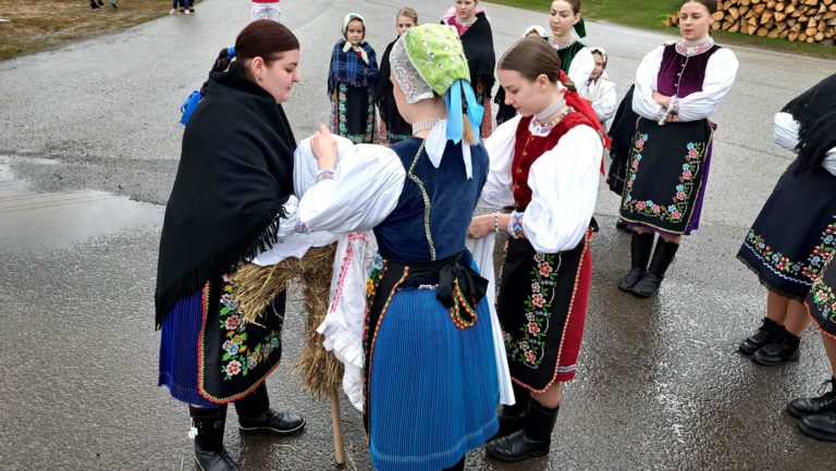 Dievčatá z folklórneho súboru v Liptovskej Tepličke vyzliekajú z kroja slamenú figurínu, krátko pred jej zapálením a vyhodením do potoka, v rámci tradície vynášania Moreny, ktorou  sa tam symbolicky snažia odohnať zimu a privolať jar. Liptovská Teplička, 10. marec 2024. Foto: SITA/Mária Frisová.
