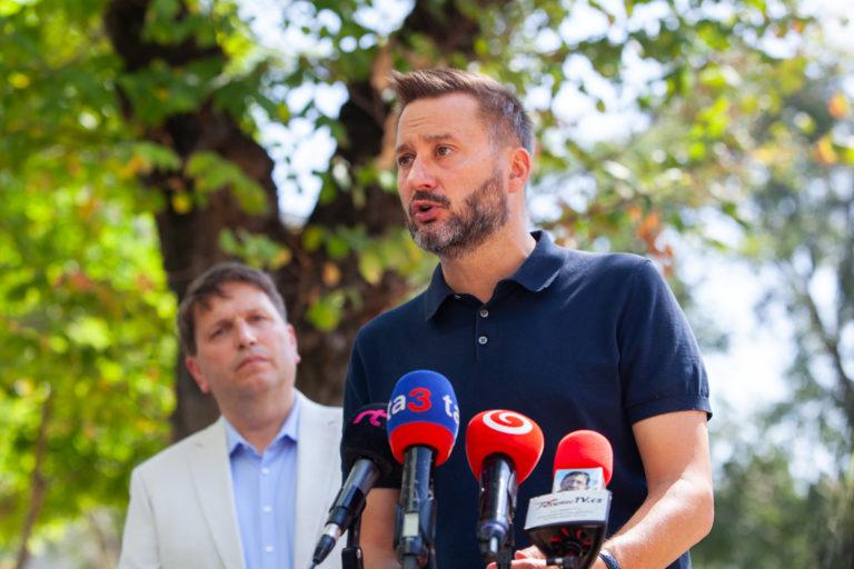 Zľava: Starosta mestskej časti Staré mesto Matej Vagač a primátor Bratislavy Matúš Vallo počas odovzdávania nového zrevitalizovaného verejného priestoru pri Základnej škole na Vazovovej ulici v Bratislave. Bratislava, 4. september 2024. Foto: SITA/Tomáš Bokor
