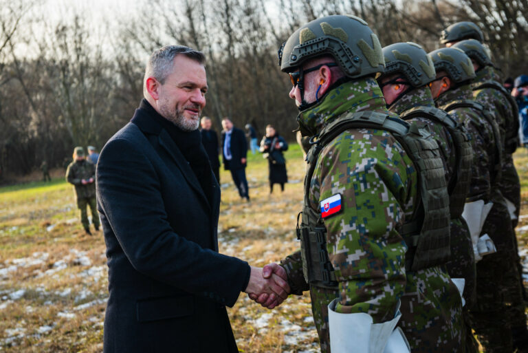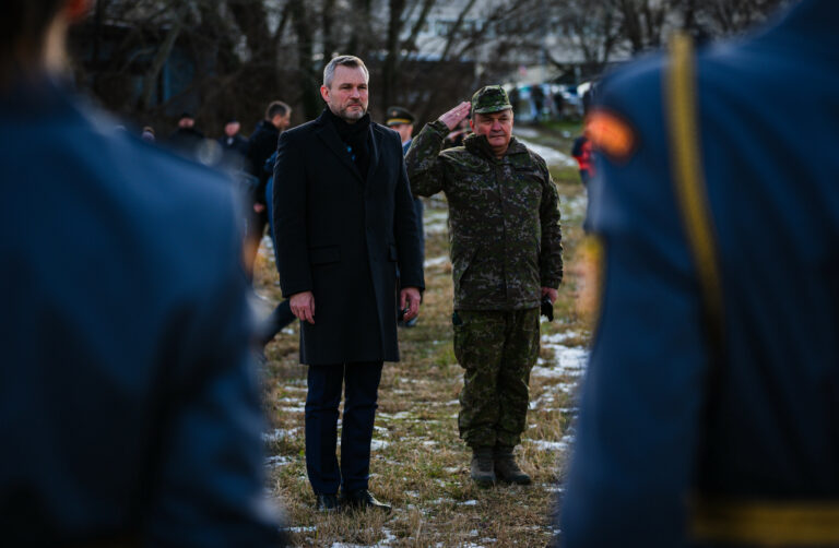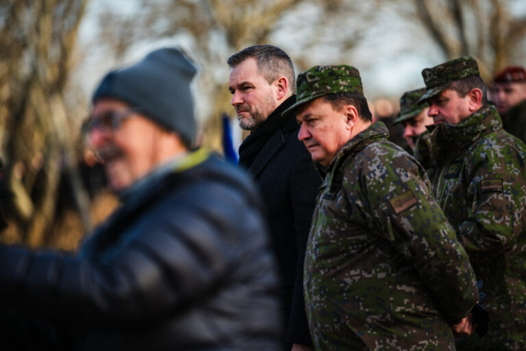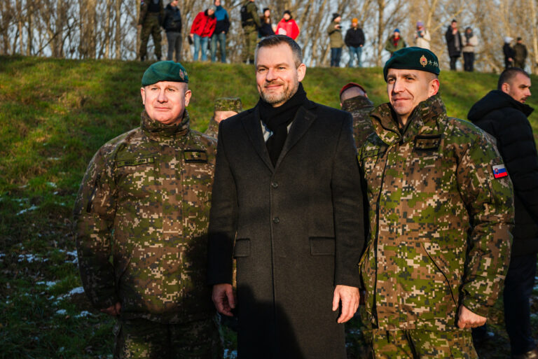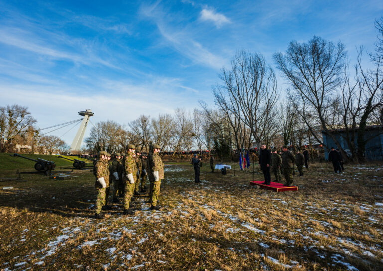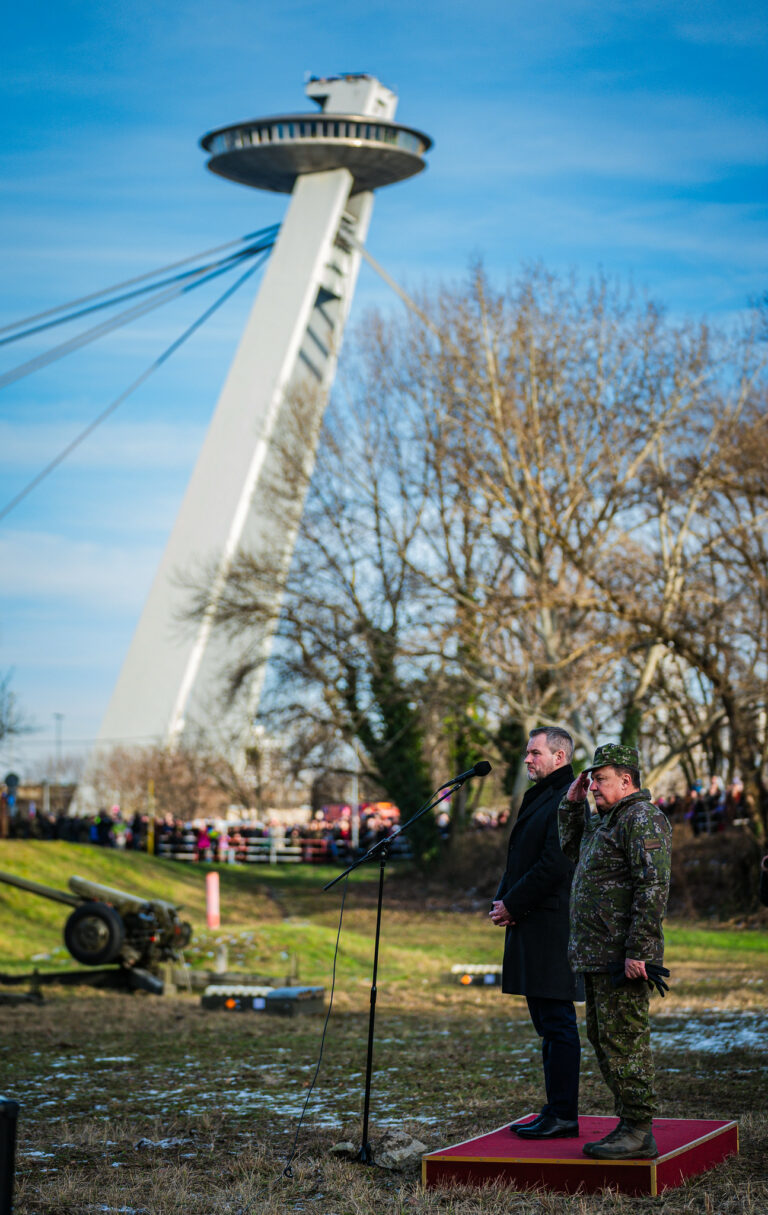 V popredí sprava: Prezident SR Peter Pellegrini a náčelník Generálneho štábu OS SR Daniel Zmeko počas príhovoru v rámci vypálenia 21 novoročných sálv delostrelcami ozbrojených síl na počesť štátneho sviatku Dňa vzniku Slovenskej republiky na nábreží Dunaja v Bratislave. Bratislava, 1. január 2026. Foto: SITA/Kancelária prezidenta