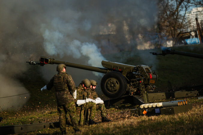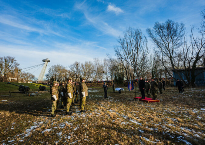 Prezident SR Peter Pellegrini (v popredí vpravo) počas vypálenia 21 novoročných sálv delostrelcami ozbrojených síl na počesť štátneho sviatku Dňa vzniku Slovenskej republiky na nábreží Dunaja v Bratislave. Bratislava, 1. január 2026. Foto: SITA/Kancelária prezidenta