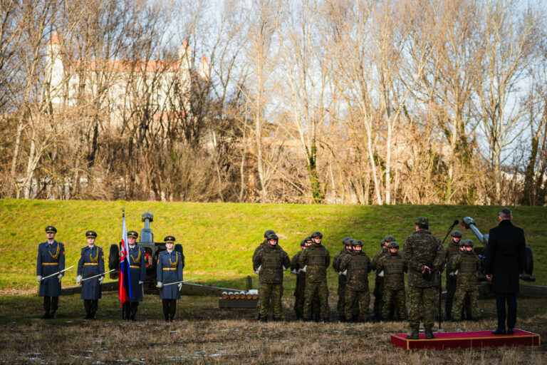 Prezident SR Peter Pellegrini (v popredí druhý zľava) počas vypálenia 21 novoročných sálv delostrelcami ozbrojených síl na počesť štátneho sviatku Dňa vzniku Slovenskej republiky na nábreží Dunaja v Bratislave. Bratislava, 1. január 2026. Foto: SITA/Kancelária prezidenta