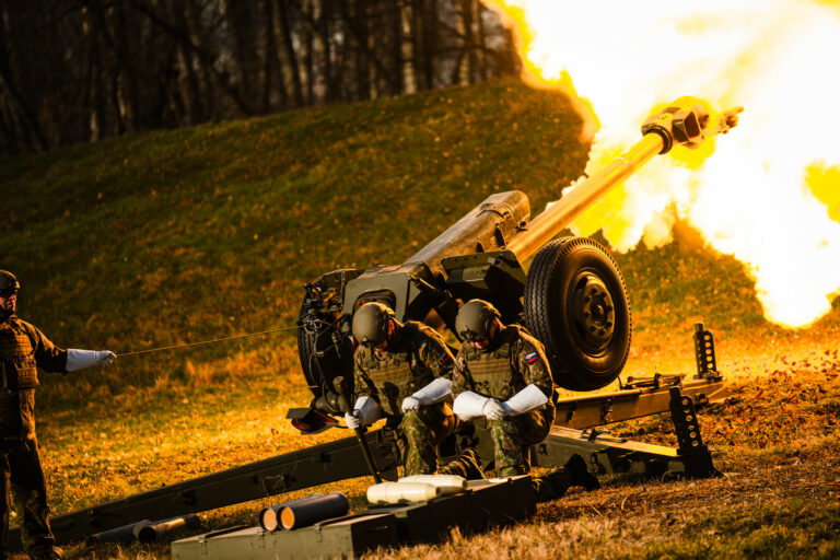 Prezident SR Peter Pellegrini (uprostred) počas vypálenia 21 novoročných sálv delostrelcami ozbrojených síl na počesť štátneho sviatku Dňa vzniku Slovenskej republiky na nábreží Dunaja v Bratislave. Bratislava, 1. január 2026. Foto: SITA/Kancelária prezidenta