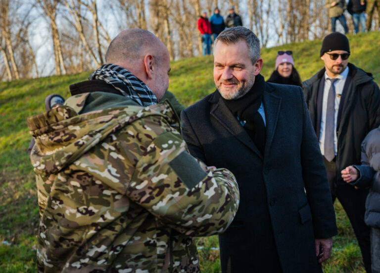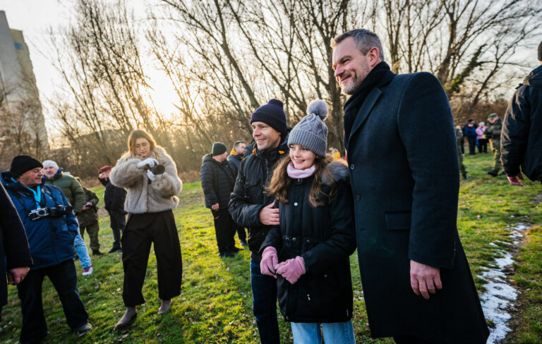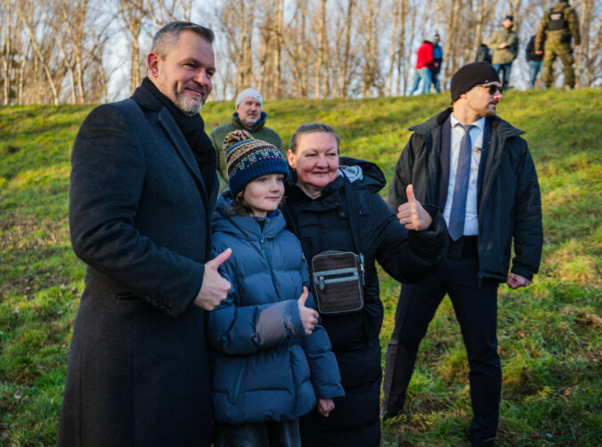 Prezident SR Peter Pellegrini (vpravo) sa fotí s občanmi počas vypálenia 21 novoročných sálv delostrelcami ozbrojených síl na počesť štátneho sviatku Dňa vzniku Slovenskej republiky na nábreží Dunaja v Bratislave. Bratislava, 1. január 2026. Foto: SITA/Kancelária prezidenta