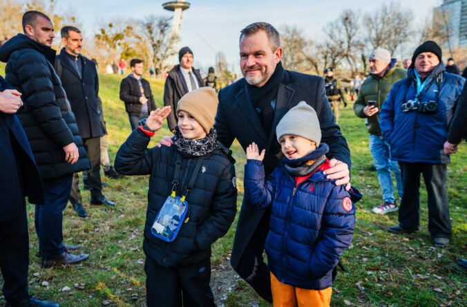 Prezident SR Peter Pellegrini (uprostred) sa fotí s deťmi počas vypálenia 21 novoročných sálv delostrelcami ozbrojených síl na počesť štátneho sviatku Dňa vzniku Slovenskej republiky na nábreží Dunaja v Bratislave. Bratislava, 1. január 2026. Foto: SITA/Kancelária prezidenta