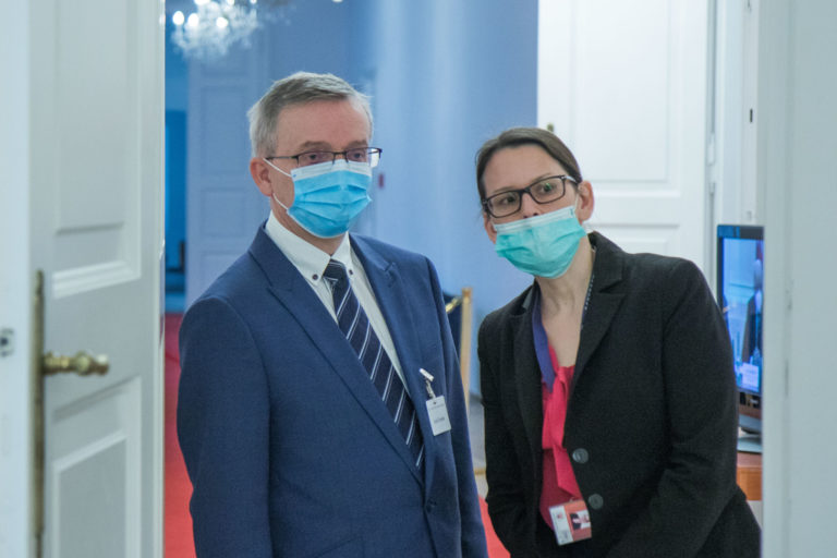 Kandidát na generálneho prokurátora Jozef Čentéš (vľavo) pred začiatkom vypočúvania kandidátov na generálneho prokurátora SR v rámci schôdze Ústavnoprávneho výboru NR SR. Bratislava, 19. november 2020. Foto: SITA/Ľudovít Vaniher