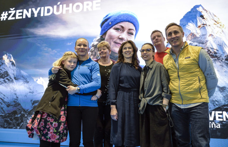 Zľava: Dcéra Lucie Janičovej, horolezkyňa Lucia Janičová, horolezkyňa Dina Šterbová, ktorá dosiahla na vrchol Mount Everestu začiatkom 90-tych rokov, riaditeľka komunikáci, sponzoringu, marketingu a rozvoja digitálnych služieb Slovenskej sporiteľne Dáša Juríková, riaditeľka Nadácie Slovenskej sporiteľne Barbara Henterová, riaditeľ Nadácie Pre deti Slovenska Ondrej Gallo a moderátor Matej Cifra - Sajfa počas vyprevádzania Lucie Janičovej na Everest v sídle Slovenskej sporiteľne v Bratislave. Bratislava, 26. marec 2024. Foto: SITA/Milan Illík.