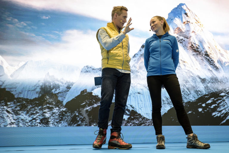 Zľava: Moderátor Matej Cifra - Sajfa a slovenská horolezkyňa a vedkyňa v oblasti imunológie Lucia Janičová počas vyprevádzania Lucie Janičovej na Everest v sídle Slovenskej sporiteľne v Bratislave. Bratislava, 26. marec 2024. Foto: SITA/Milan Illík.