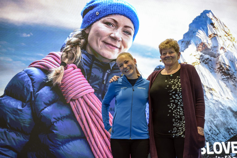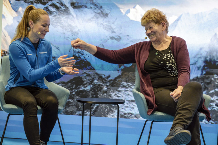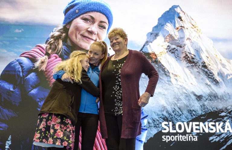 Zľava: Dcéra Lucie Janičovej, slovenská horolezkyňa a vedkyňa v oblasti imunológie Lucia Janičová a horolezkyňa Dina Šterbová, ktorá dosiahla na vrchol Mount Everestu začiatkom 90-tych rokov počas vyprevádzania Lucie Janičovej na Everest v sídle Slovenskej sporiteľne v Bratislave. Bratislava, 26. marec 2024. Foto: SITA/Milan Illík.