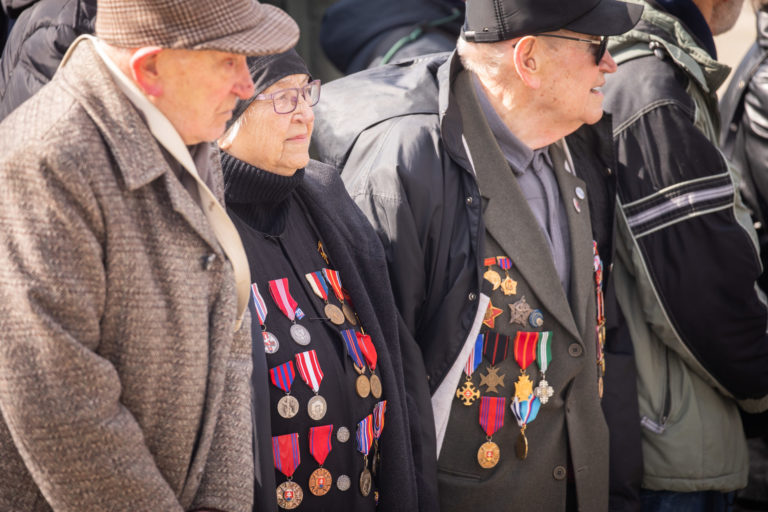 Účastníci počas pietneho aktu pri príležitosti 78. výročia oslobodenia hlavného mesta Bratislava pri pamätníku Slavín v Bratislave. Bratislava, 04. apríl 2023. Foto: SITA/Diana Černáková
