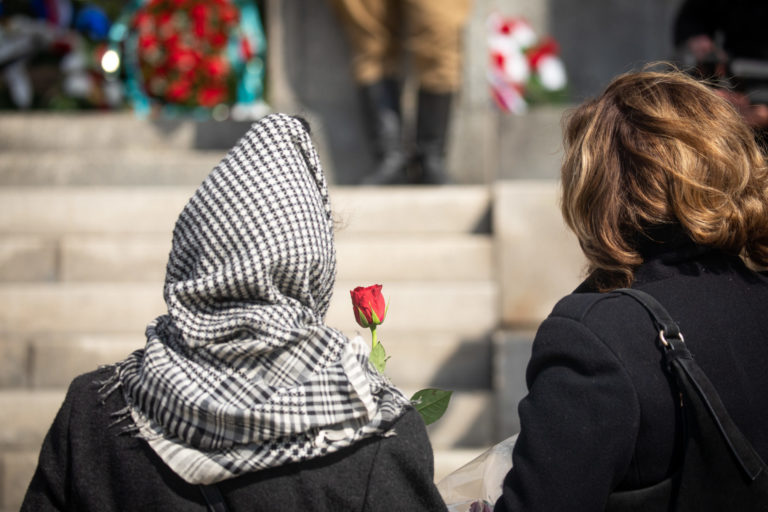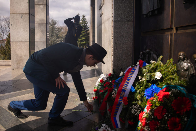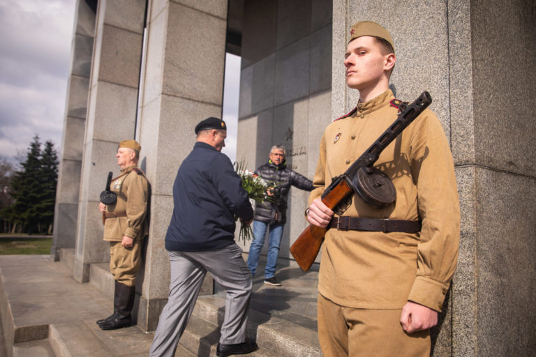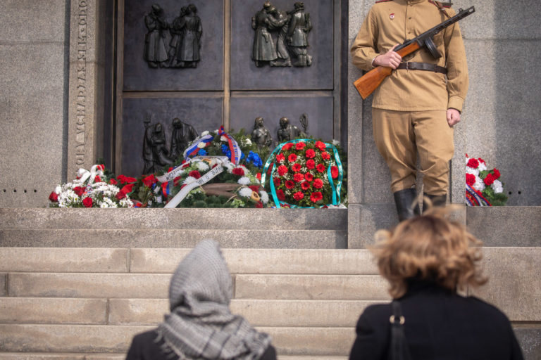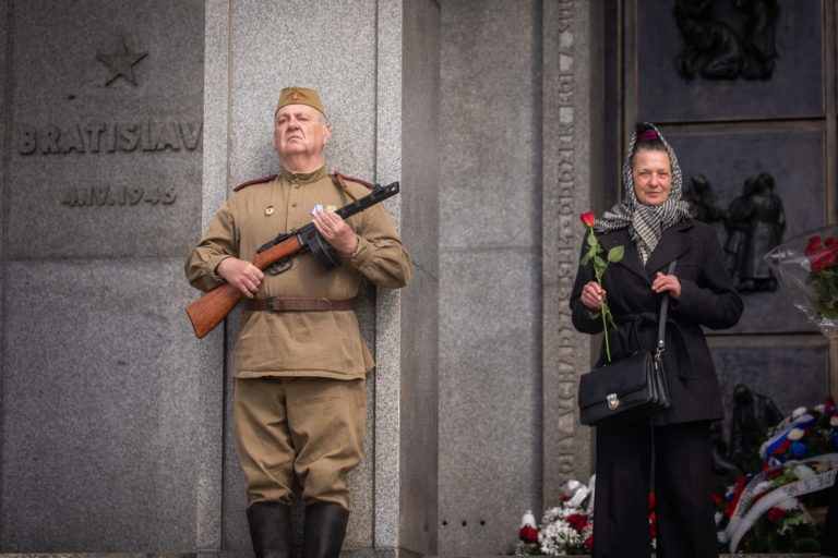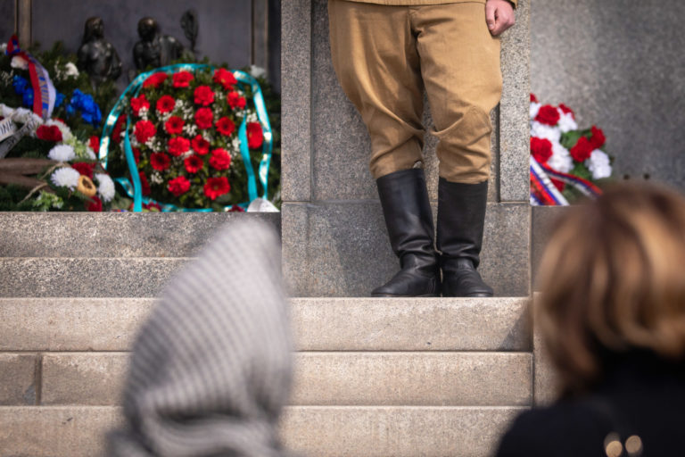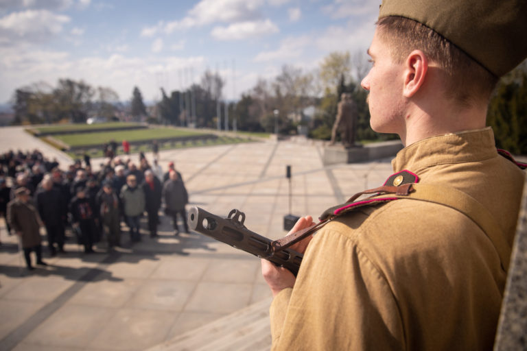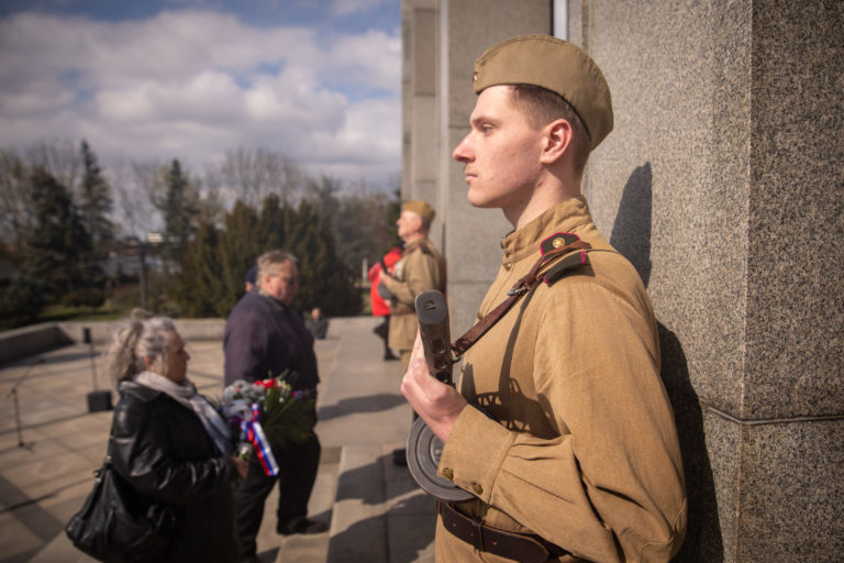 Účastník počas pietneho aktu pri príležitosti 78. výročia oslobodenia hlavného mesta Bratislava pri pamätníku Slavín v Bratislave. Bratislava, 04. apríl 2023. Foto: SITA/Diana Černáková