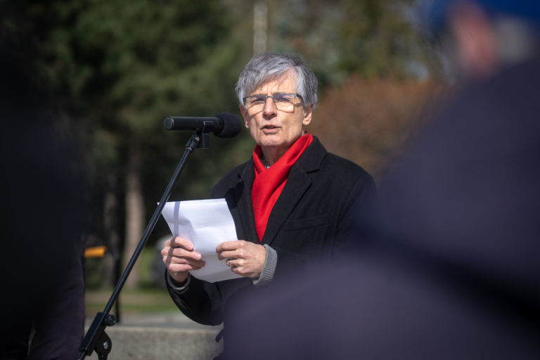 Bývalý diplomat a politik Peter Weiss v príhovore počas pietneho aktu pri príležitosti 78. výročia oslobodenia hlavného mesta Bratislavy pri pamätníku Slavín v Bratislave. Bratislava, 04. apríl 2023. Foto: SITA/Diana Černáková