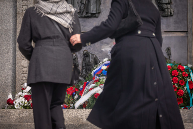 Účastníci počas pietneho aktu pri príležitosti 78. výročia oslobodenia hlavného mesta Bratislavy pri pamätníku Slavín v Bratislave. Bratislava, 04. apríl 2023. Foto: SITA/Diana Černáková