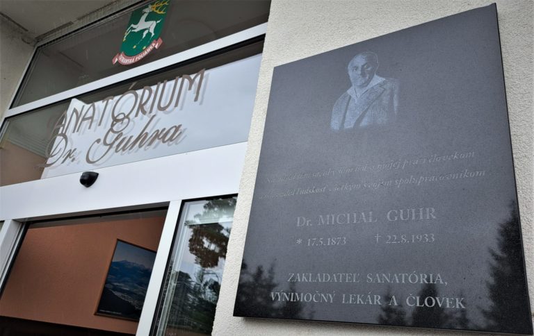 Odhalená tabuľa venovaná Dr. Michalovi Guhrovi na budove po ňom pomenovaného sanatória v Tatranskej Polianke vo Vysokých Tatrách. Tatranská Polianka, 28. júl 2023. Foto: SITA/Mária Frisová.