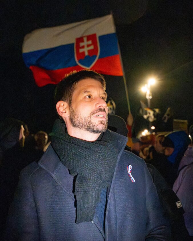 Predseda hnutia Progresívne Slovensko Michal Šimečka počas zhromaždenia na Námestí slobody v Bratislave pri príležitosti výročia Nežnej revolúcie a Dňa boja za slobodu a demokraciu. Bratislava, 17. november 2025. Foto: SITA/Facebook Progresívne Slovensko