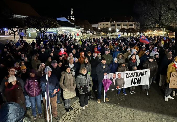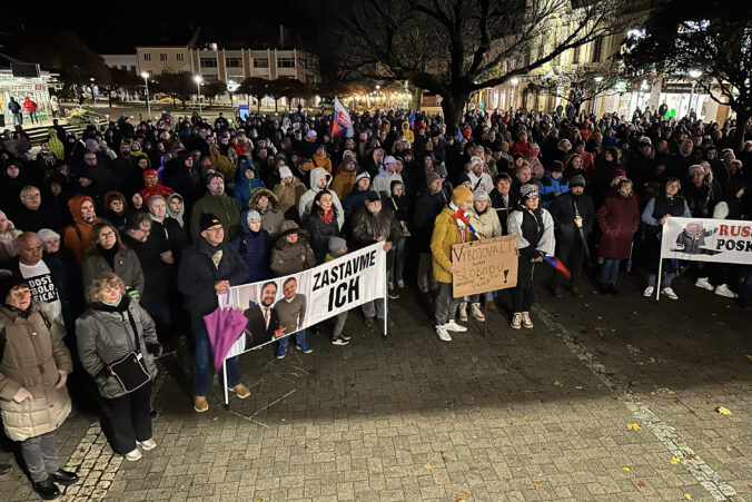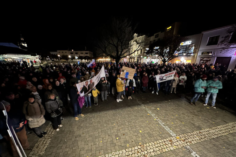 Účastníci počas zhromaždenia s názvom Nevezmú nám November, ktoré organizovali Sloboda a Solidarita (SaS) Nové Mesto nad Váhom a Demokrati - Trenčiansky kraj pri príležitosti výročia Nežnej revolúcie a Dňa boja za slobodu a demokraciu na Námestí slobody v Novom Meste nad Váhom. Nové Mesto nad Váhom, 17. november 2025. Foto: SITA/Michal Jamrich