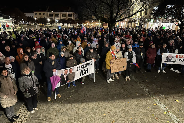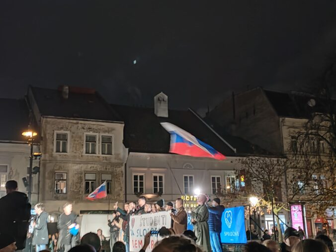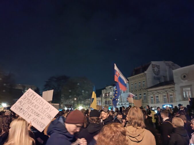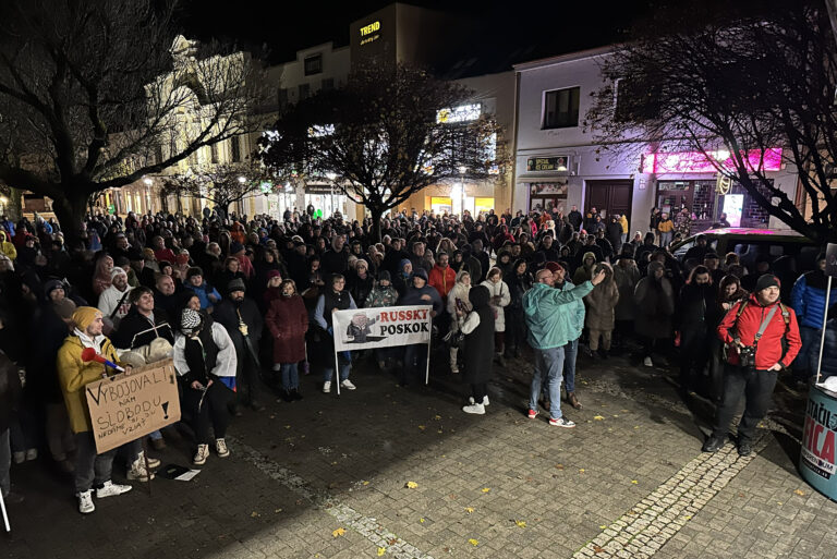 Účastníci počas zhromaždenia „V ’89 sme si slobodu vyštrngali, dnes ju musíme brániť“, ktoré zorganizovalo občianske združenie Mier Ukrajine pri príležitosti výročia Nežnej revolúcie a Dňa boja za slobodu a demokraciu na Námestí slobody v Bratislave. Bratislava, 17. november 2025. Foto: SITA/Mier Ukrajine