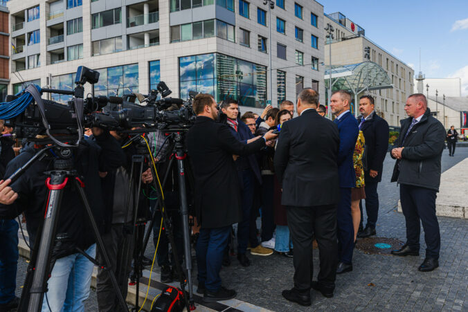 Prezident SR Peter Pellegrini (v popredí tretí sprava) počas položenia venca k Pamätníku M. R. Štefánika na Námestí Milana Rastislava Štefánika v Bratislave pri príležitosti 107. výročia Dňa vzniku samostatného Česko-Slovenska. Bratislava, 28. október 2025. Foto: SITA/Kancelária prezidenta