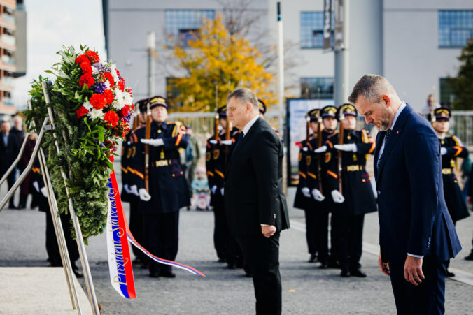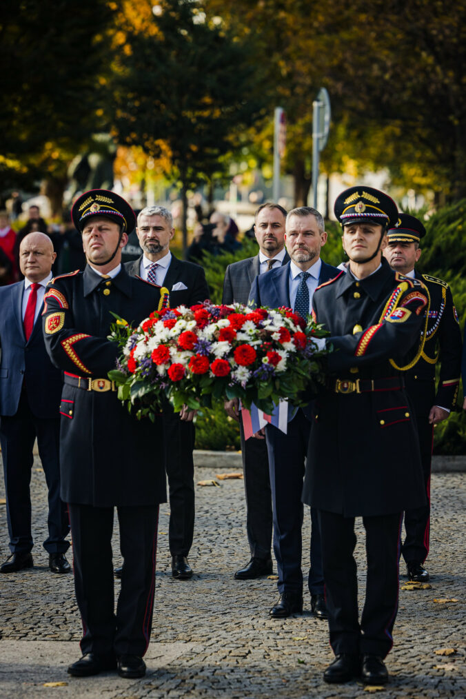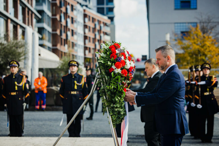 Prezident SR Peter Pellegrini (tretí sprava) počas položenia venca k Pamätníku československej štátnosti na Vajanského nábreží v Bratislave pri príležitosti 107. výročia Dňa vzniku samostatného Česko-Slovenska. Bratislava, 28. október 2025. Foto: SITA/Kancelária prezidenta