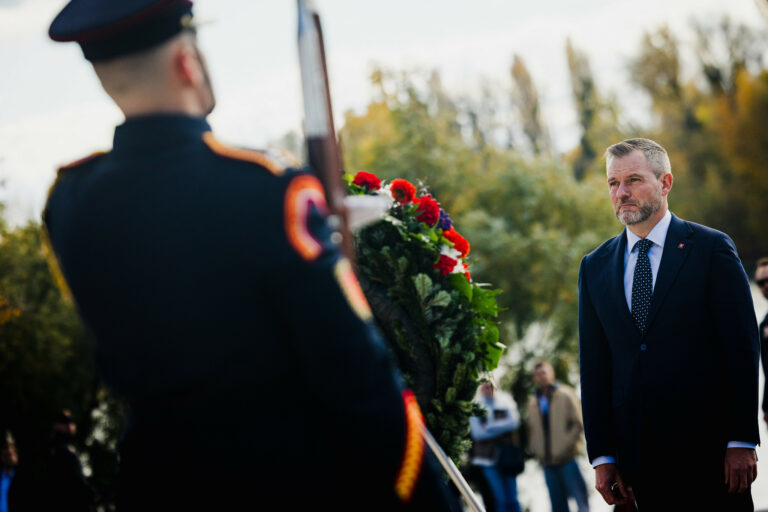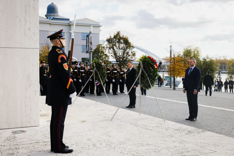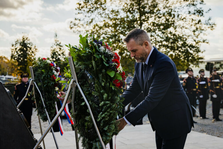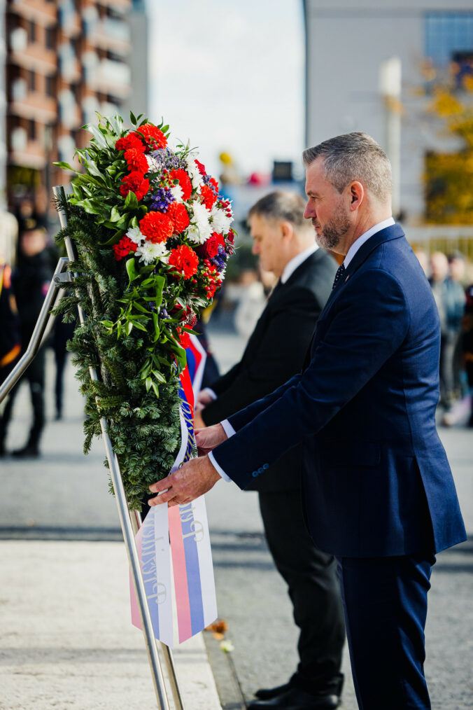 Prezident SR Peter Pellegrini (v popredí) počas položenia venca k Pamätníku československej štátnosti na Vajanského nábreží v Bratislave pri príležitosti 107. výročia Dňa vzniku samostatného Česko-Slovenska. Bratislava, 28. október 2025. Foto: SITA/Kancelária prezidenta