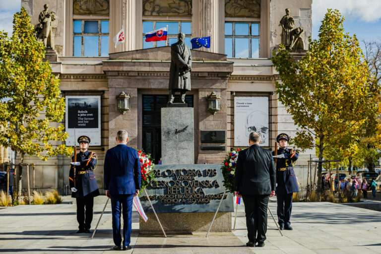 Prezident SR Peter Pellegrini (vpravo) počas položenia venca k Pamätníku M. R. Štefánika na Námestí Milana Rastislava Štefánika v Bratislave pri príležitosti 107. výročia Dňa vzniku samostatného Česko-Slovenska. Bratislava, 28. október 2025. Foto: SITA/Kancelária prezidenta