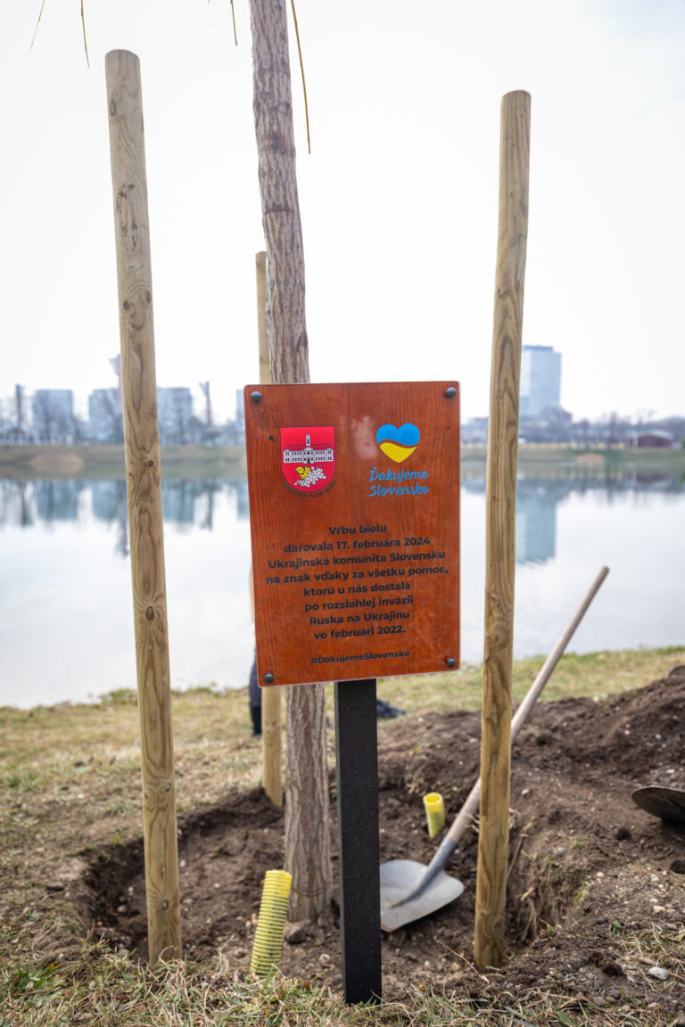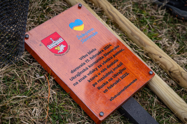 Tabuľa označujúca „strom vďaky“ počas jeho vysádzania pri jazere Kuchajda a zavŕšenia série podujatí, organizovaných Iniciatívou Ďakujeme Slovensko, prostredníctvom ktorých sa ukrajinská komunita odvďačila Slovensku za prijatie a pomoc v čase núdze. Bratislava, 17. február 2024. Foto: SITA/Jana Birošová