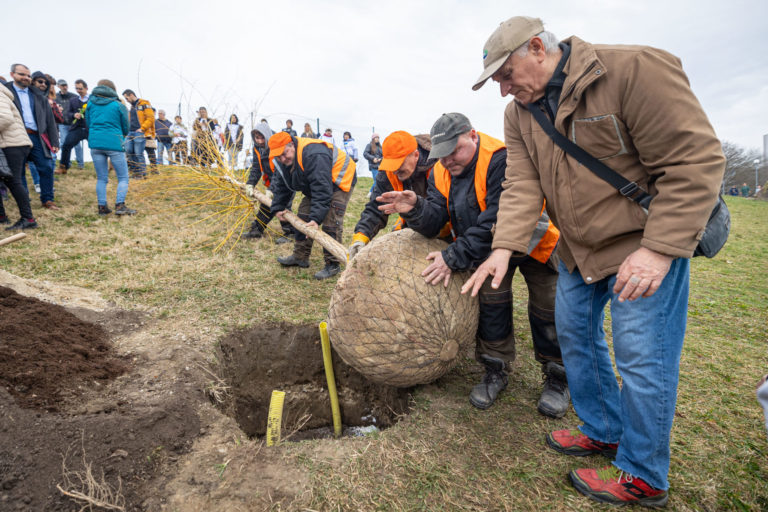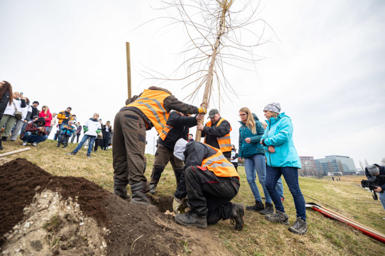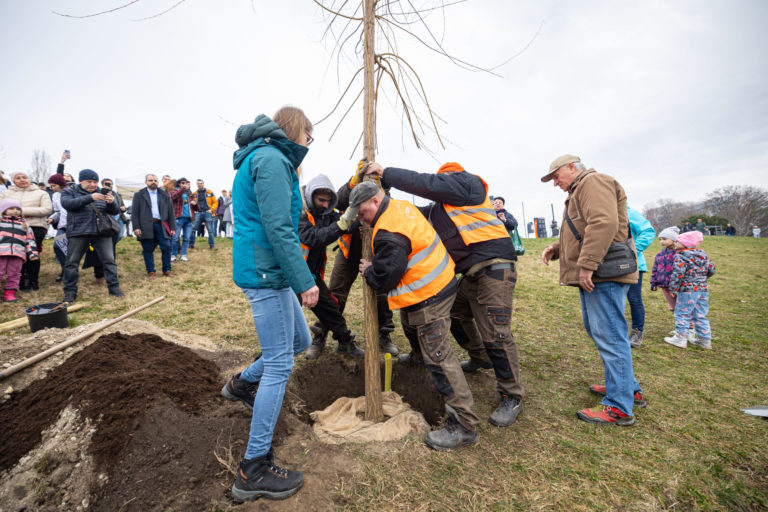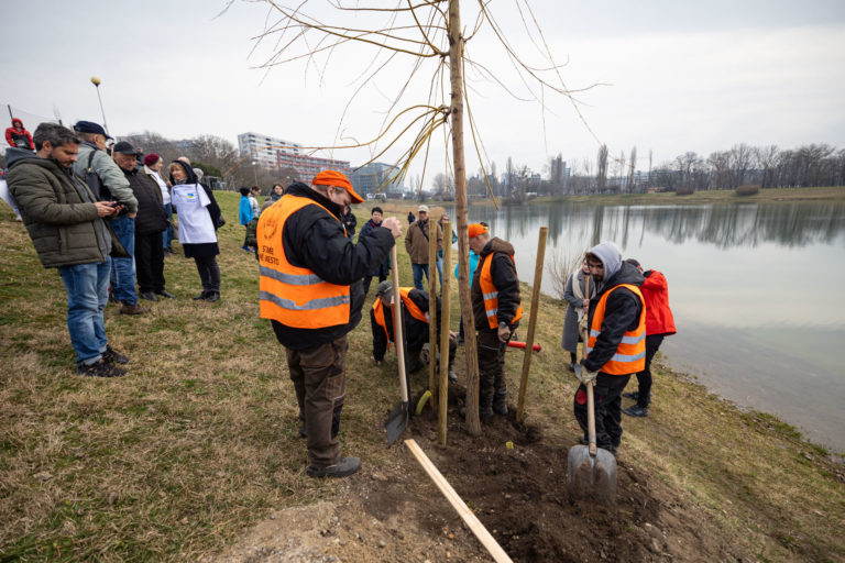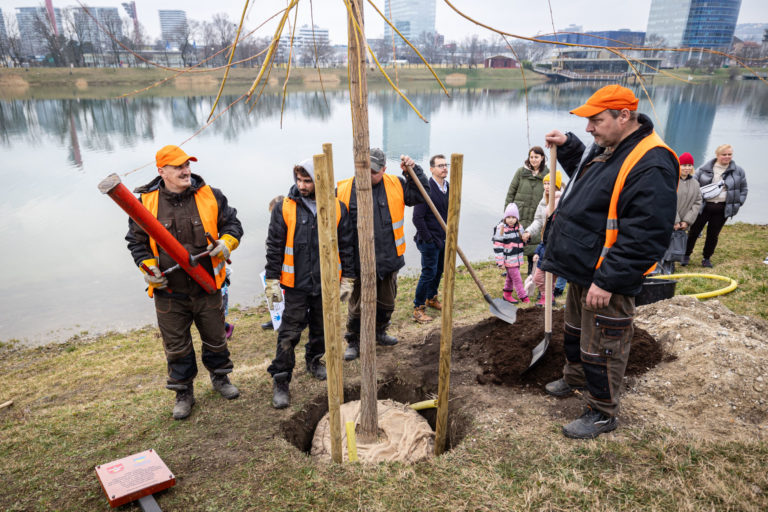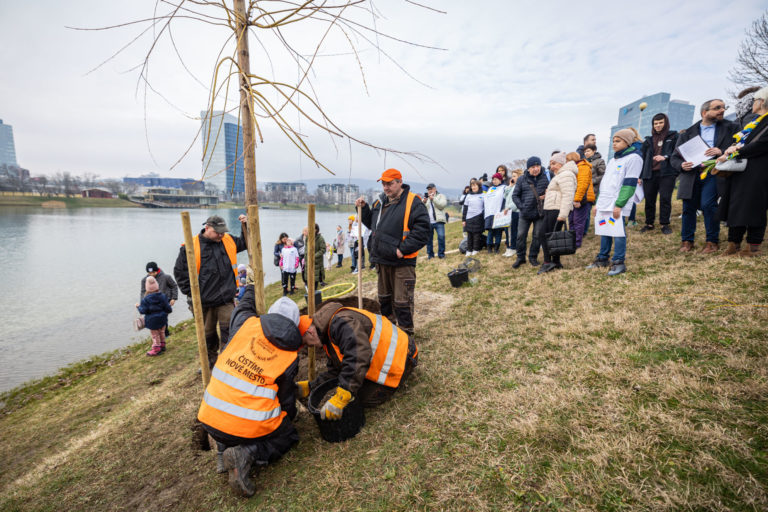 „Strom vďaky“ vysadený účastníkmi pri jazere Kuchajda, čím zavŕšili série podujatí, organizovaných Iniciatívou Ďakujeme Slovensko, prostredníctvom ktorých sa ukrajinská komunita odvďačila Slovensku za prijatie a pomoc v čase núdze. Bratislava, 17. február 2024. Foto: SITA/Jana Birošová