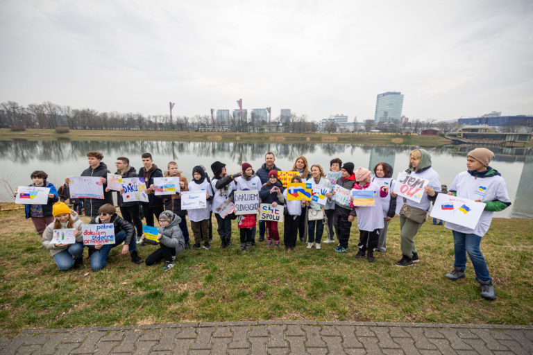 Účastníci po vysadení „stromu vďaky“ pri jazere Kuchajda zavŕšili série podujatí, organizovaných Iniciatívou Ďakujeme Slovensko, prostredníctvom ktorých sa ukrajinská komunita odvďačila Slovensku za prijatie a pomoc v čase núdze. Bratislava, 17. február 2024. Foto: SITA/Jana Birošová