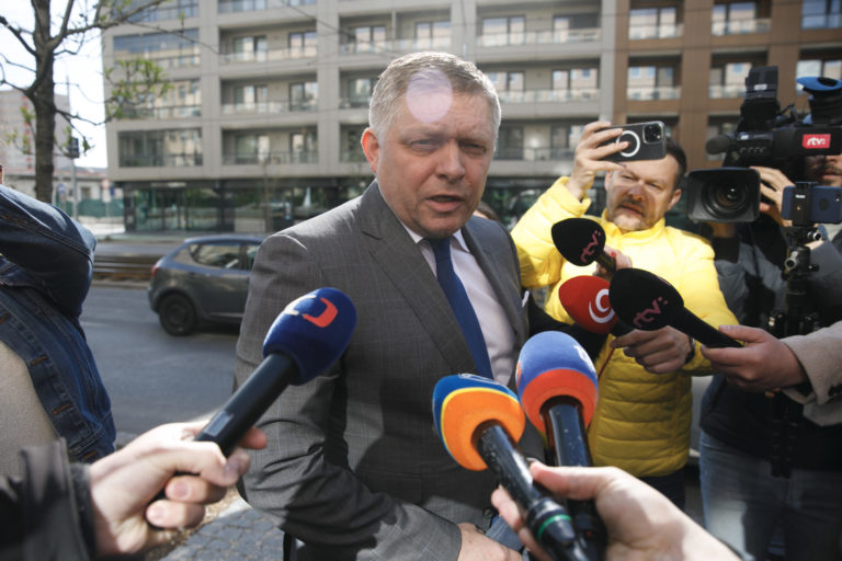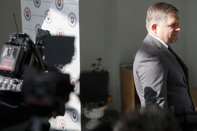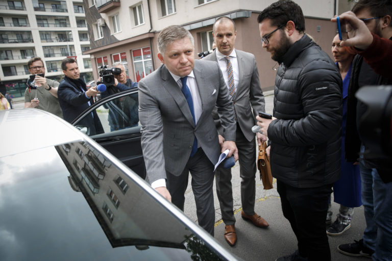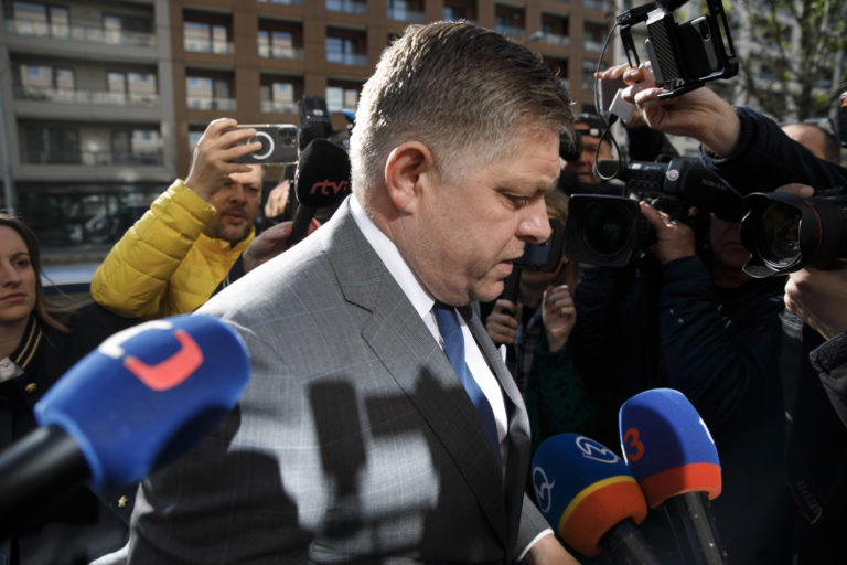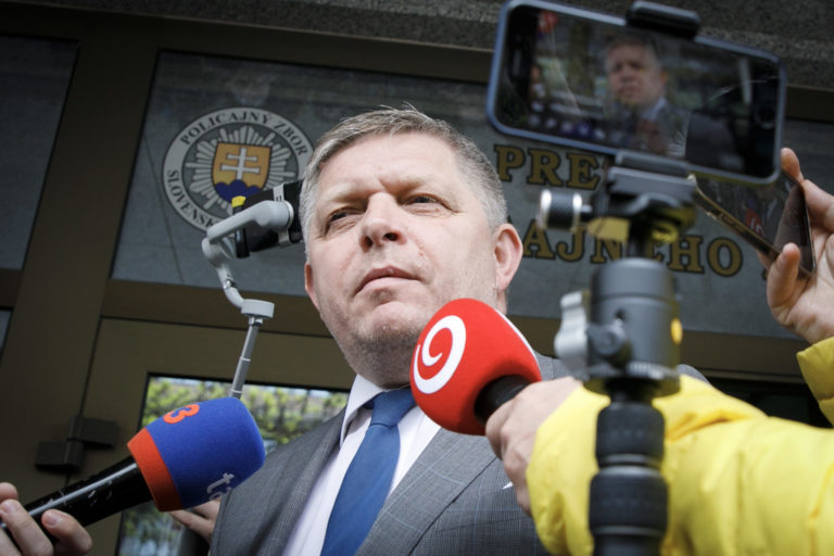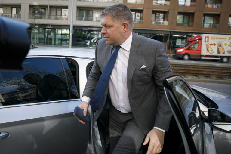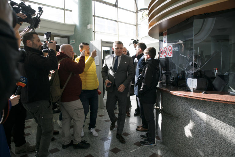 Predseda strany Smer - sociálna demokracia a bývalý premiér SR Robert Fico počas príchodu na Prezídium Policajného zboru SR v Bratislave v rámci výsluchu v súvislosti s jeho obvinením zo založenia a zosnovania zločineckej skupiny. Foto: SITA/Branislav Bibel