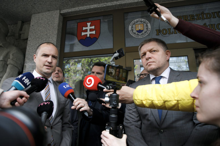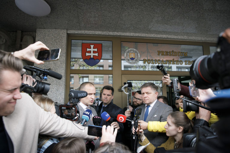 Uprostred zľava: Predseda strany Smer - sociálna demokracia Robert Fico a advokát Roberta Fica David Lindtner odchádzajú z Prezídia Policajného zboru SR v Bratislave po výsluchu v súvislosti s obvinením Roberta Fica zo založenia a zosnovania zločineckej skupiny. Foto: SITA/Branislav Bibel