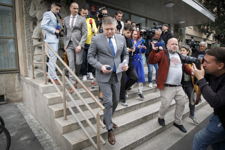 Predseda strany Smer - sociálna demokracia a bývalý premiér SR Robert Fico (v popredí) počas príchodu na Prezídium Policajného zboru SR v Bratislave v rámci výsluchu v súvislosti s jeho obvinením zo založenia a zosnovania zločineckej skupiny. Foto: SITA/Branislav Bibel
