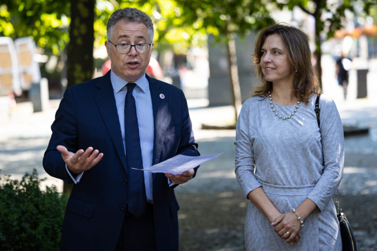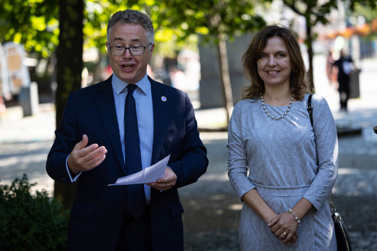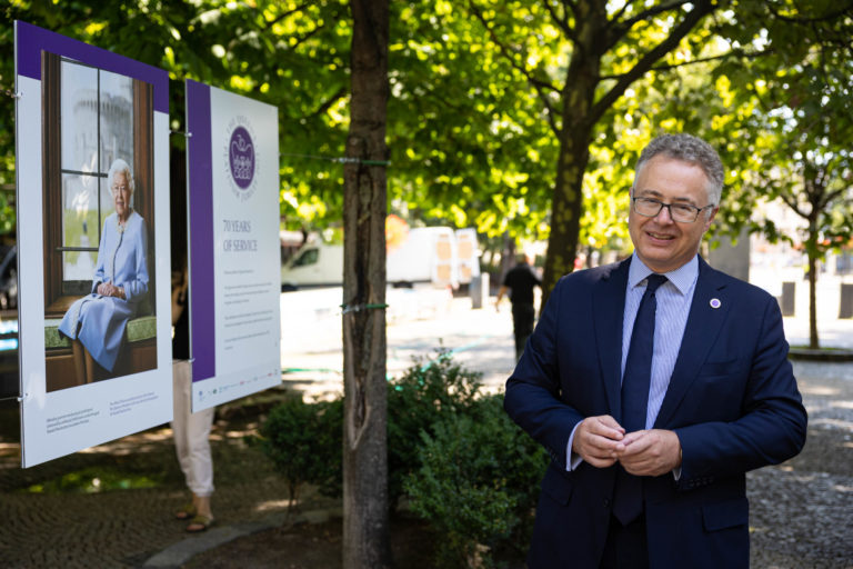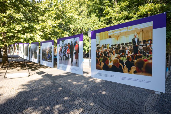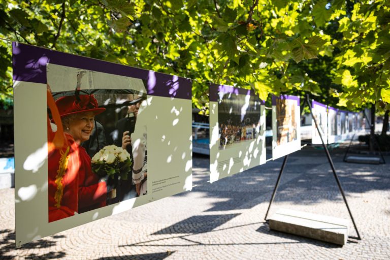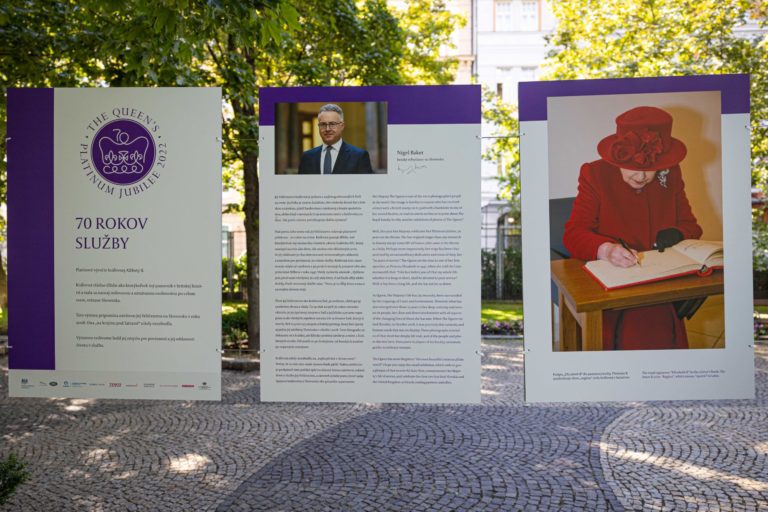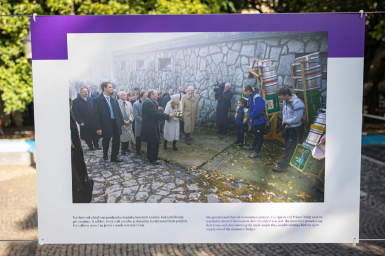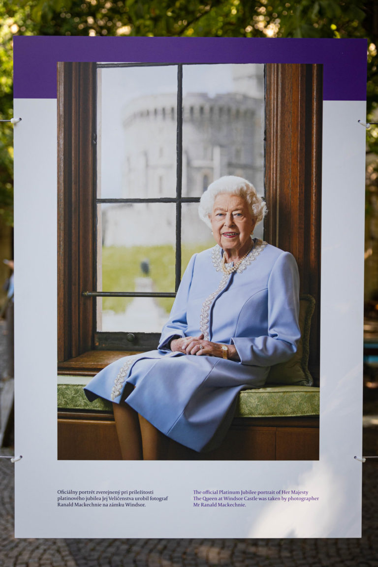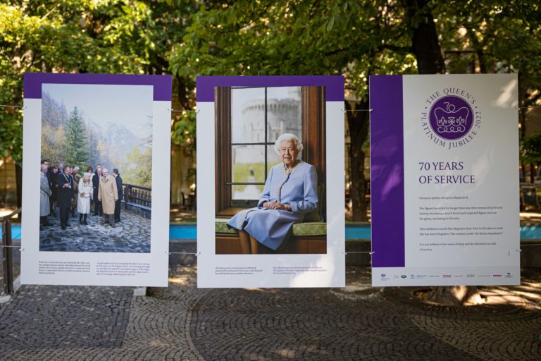Britský veľvyslanec na Slovensku Nigel Baker a starostka bratislavskej mestskej časti Staré Mesto Zuzana Aufrichtová otvorili na Hviezdoslavovom námestí v Bratislave výstavu fotografií kráľovnej Alžbety II. s názvom „70 rokov služby” aj s doteraz nezverejnenými fotografiami kráľovského páru zo štátnej návštevy Slovenska v roku 2008. Foto: SITA/Jana Birošová