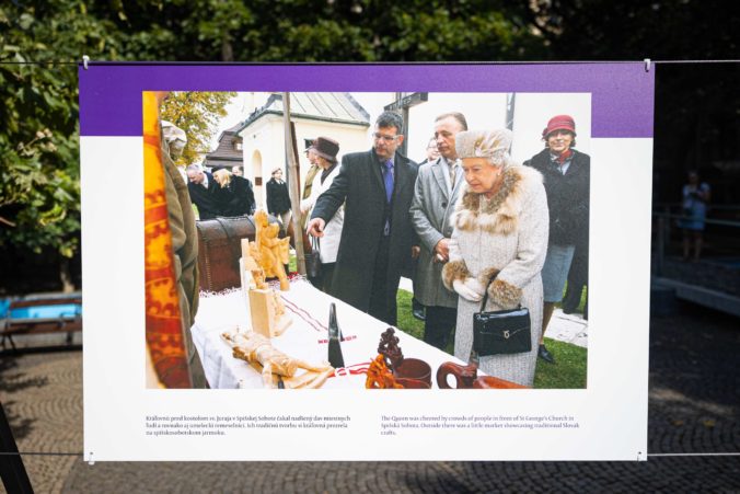 Fotografie kráľovnej Alžbety II. na Hviezdoslavovom námestí v Bratislave počas otvorenia výstavy s názvom „70 rokov služby” aj s doteraz nezverejnenými fotografiami kráľovského páru zo štátnej návštevy Slovenska v roku 2008. Foto: SITA/Jana Birošová