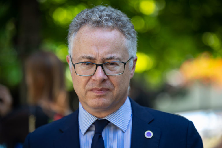 Britský veľvyslanec na Slovensku Nigel Baker otvoril na Hviezdoslavovom námestí v Bratislave výstavu fotografií kráľovnej Alžbety II. s názvom „70 rokov služby” aj s doteraz nezverejnenými fotografiami kráľovského páru zo štátnej návštevy Slovenska v roku 2008. Foto: SITA/Jana Birošová