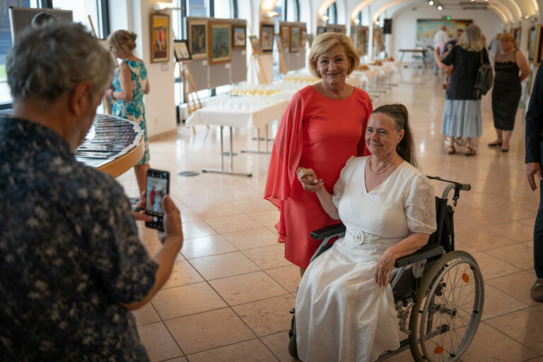 Poslankyňa Národnej rady (NR) SR za stranu HLAS - sociálna demokracia Ľubica Laššáková (vľavo) počas výstavy Kovačické insitné maliarstvo na Bratislavskom hrade, nad ktorou prevzala záštitu. Bratislava, 15. júl 2025. Foto: SITA/HLAS – sociálna demokracia