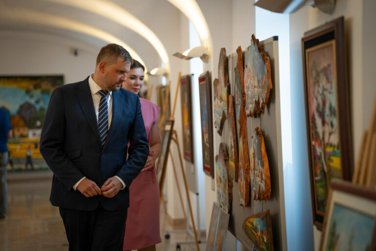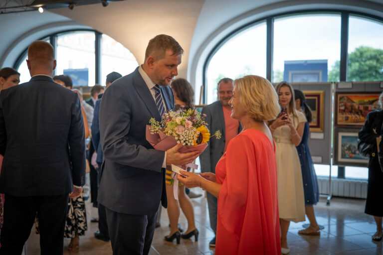 Minister zdravotníctva SR Kamil Šaško (vľavo) počas výstavy Kovačické insitné maliarstvo na Bratislavskom hrade, nad ktorou prevzala záštitu poslankyňa Národnej rady (NR) SR za stranu HLAS - sociálna demokracia Ľubica Laššáková. Bratislava, 15. júl 2025. Foto: SITA/HLAS – sociálna demokracia