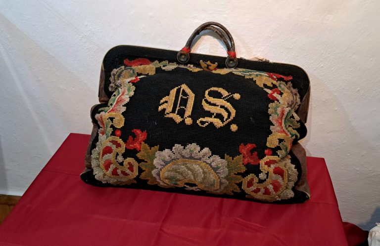 Cestovná taška z 19. storočia vyšívaná gobelínom vystavená v Múzeu v Kežmarku v rámci výstavy Móda 19. storočia. Kežmarok, 29. december 2023. Foto: SITA/Mária Frisová