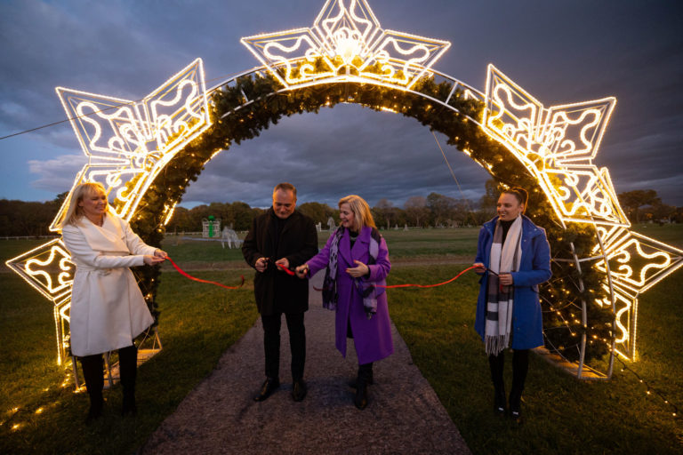 Sprava uprostred: Majiteľka spoločnosti Decoled Eva Poláčková a riaditeľ štátneho podniku Závodisko-Dostihová dráha Ladislav Molnár počas rozsvietenia prvého svetelného parku na dostihovej dráhe v bratislavskej Petržalke s názvom Svetlá rozprávajú. Bratislava, 15. november 2023. Foto: SITA/Jana Birošová