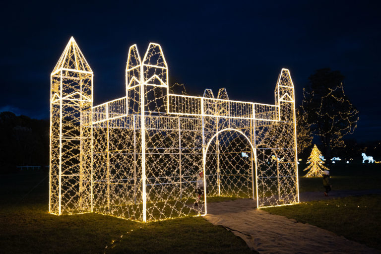 Svetelná imitácia Bratislavského hradu počas rozsvietenia prvého svetelného parku na dostihovej dráhe v bratislavskej Petržalke s názvom Svetlá rozprávajú. Bratislava, 15. november 2023. Foto: SITA/Jana Birošová
