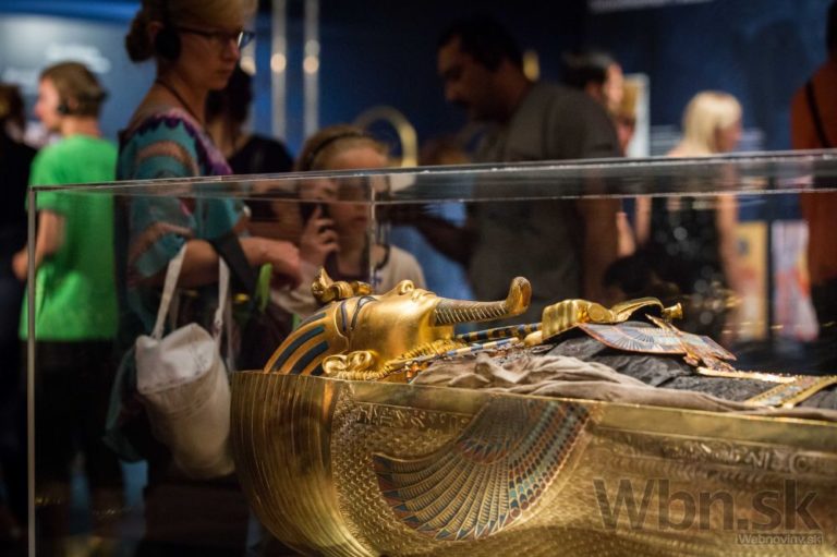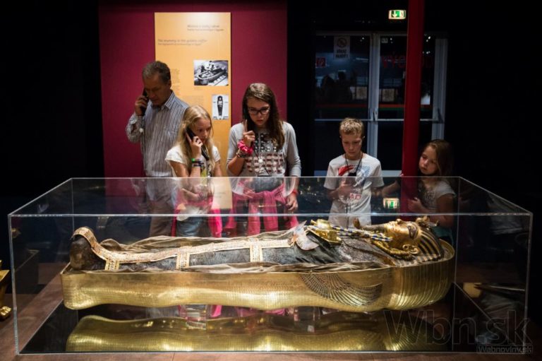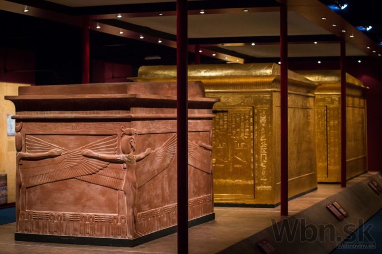 Pohľad na sarkofág faraóna Tutanchamona počas výstavy Tutanchamon. Ide o rekonštrukciu pokladov a hrobky faraóna Tutanchamona, ktoré objavil egyptológ Howard Carter. Bratislava, 16. august 2014. Foto: SITA/Jozef Jakubčo