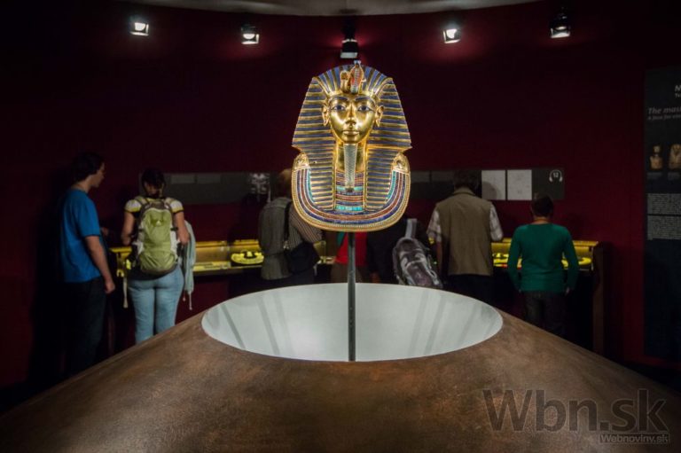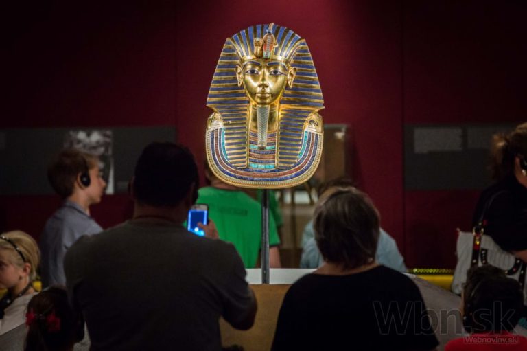 Pohľad na posmrtnú masku faraóna Tutanchamona počas výstavy Tutanchamon. Ide o rekonštrukciu pokladov a hrobky faraóna Tutanchamona, ktorú objavil egyptológ Howard Carter. Bratislava, 16. august 2014.