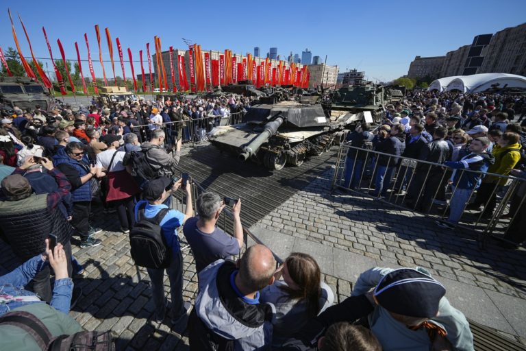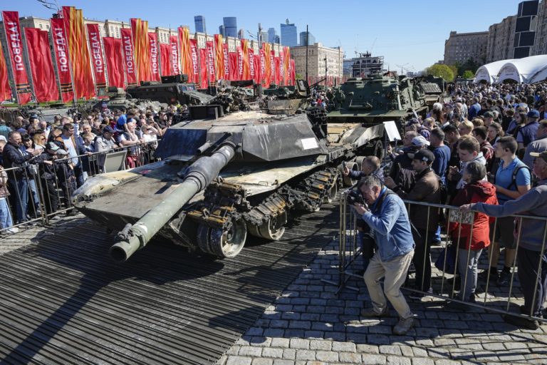 Americký tank M1A1 Abrams, ktorý zasiahli a zajali ruské jednotky počas bojov na Ukrajine, je vystavený v Moskve v stredu 1. mája 2024. Foto: SITA/AP