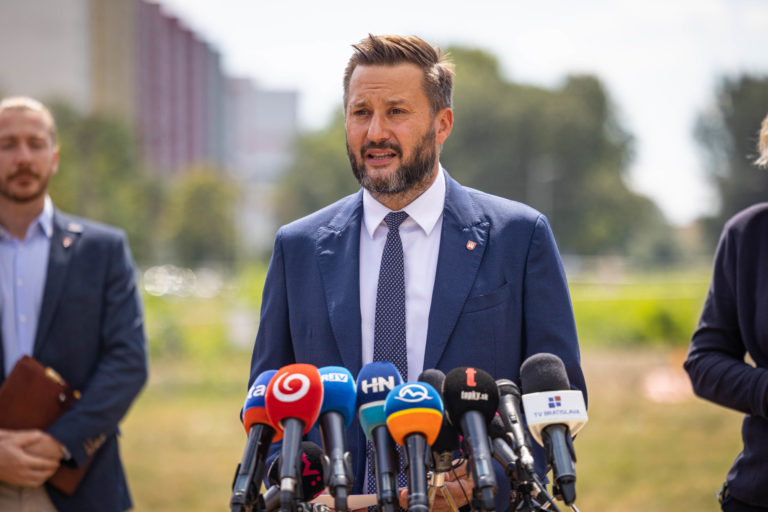 Primátor Bratislavy Matúš Vallo počas tlačového brífingu na tému: Aktuálne informácie súvisiace s električkovou traťou v úseku Bosákova - Janíkov dvor v bratislavskej Petržalke. Bratislava, 9. august 2022. Foto: SITA/Jana Birošová