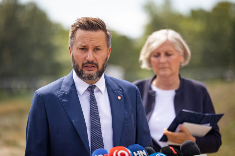 Sprava: Primátor Bratislavy Matúš Vallo a prvá viceprimátorka Tatiana Kratochvílová počas tlačového brífingu na tému: Aktuálne informácie súvisiace s električkovou traťou v úseku Bosákova - Janíkov dvor v bratislavskej Petržalke. Bratislava, 9. august 2022. Foto: SITA/Jana Birošová