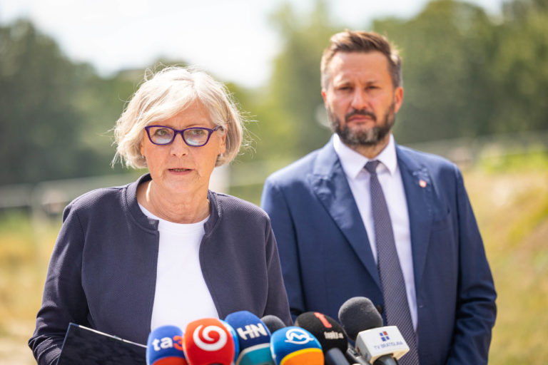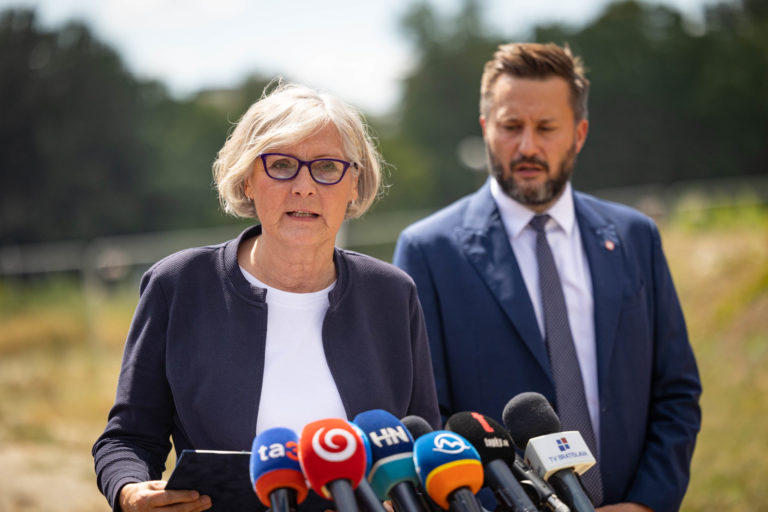 Zľava: Primátor Bratislavy Matúš Vallo a prvá viceprimátorka Tatiana Kratochvílová počas tlačového brífingu na tému: Aktuálne informácie súvisiace s električkovou traťou v úseku Bosákova - Janíkov dvor v bratislavskej Petržalke. Bratislava, 9. august 2022. Foto: SITA/Jana Birošová