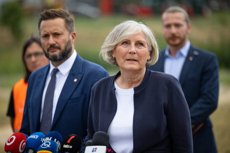Zľava v popredí: Primátor Bratislavy Matúš Vallo a prvá viceprimátorka Tatiana Kratochvílová počas tlačového brífingu na tému: Aktuálne informácie súvisiace s električkovou traťou v úseku Bosákova - Janíkov dvor v bratislavskej Petržalke. Bratislava, 9. august 2022. Foto: SITA/Jana Birošová