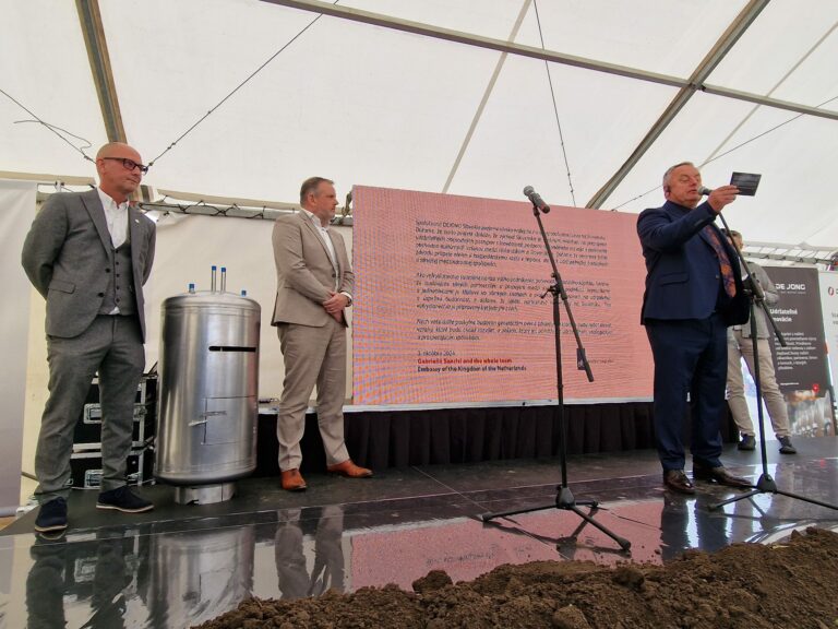 Honorárny konzul Holandského kráľovstva na Slovensku Matúš Murajda (vpravo) číta odkaz umiestnený do časovej schránky, pri ktorej stoja riaditeľ závodu Dejong Slovakia Lee Fletcher (vľavo) a výkonný riaditeľ Rheem Europe Arno La Haye (uprostred) pri slávnostnom začatí výstavby nového závodu spoločnosti Dejong v Prešove. Prešov, 3. októbra 2024. Foto: SITA/Ivan Kriššák