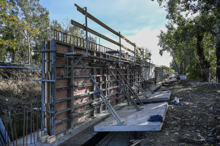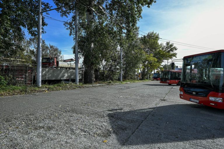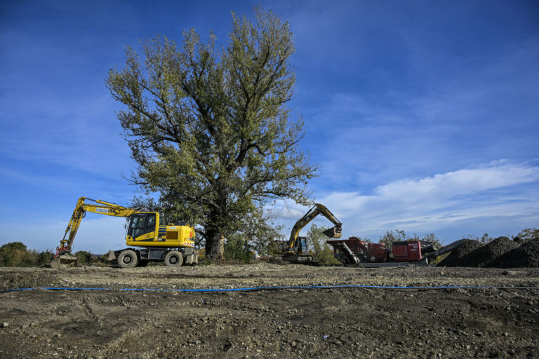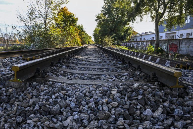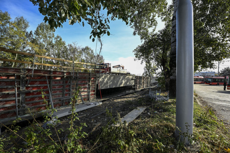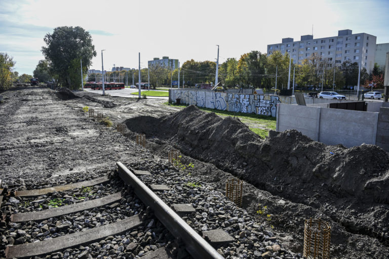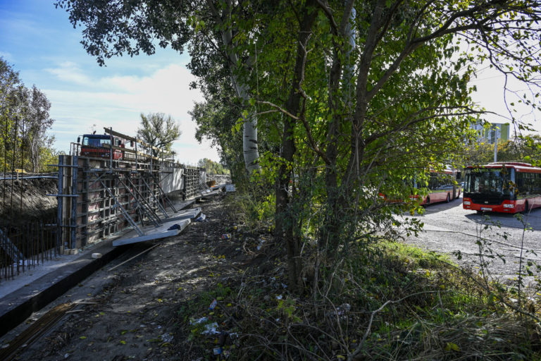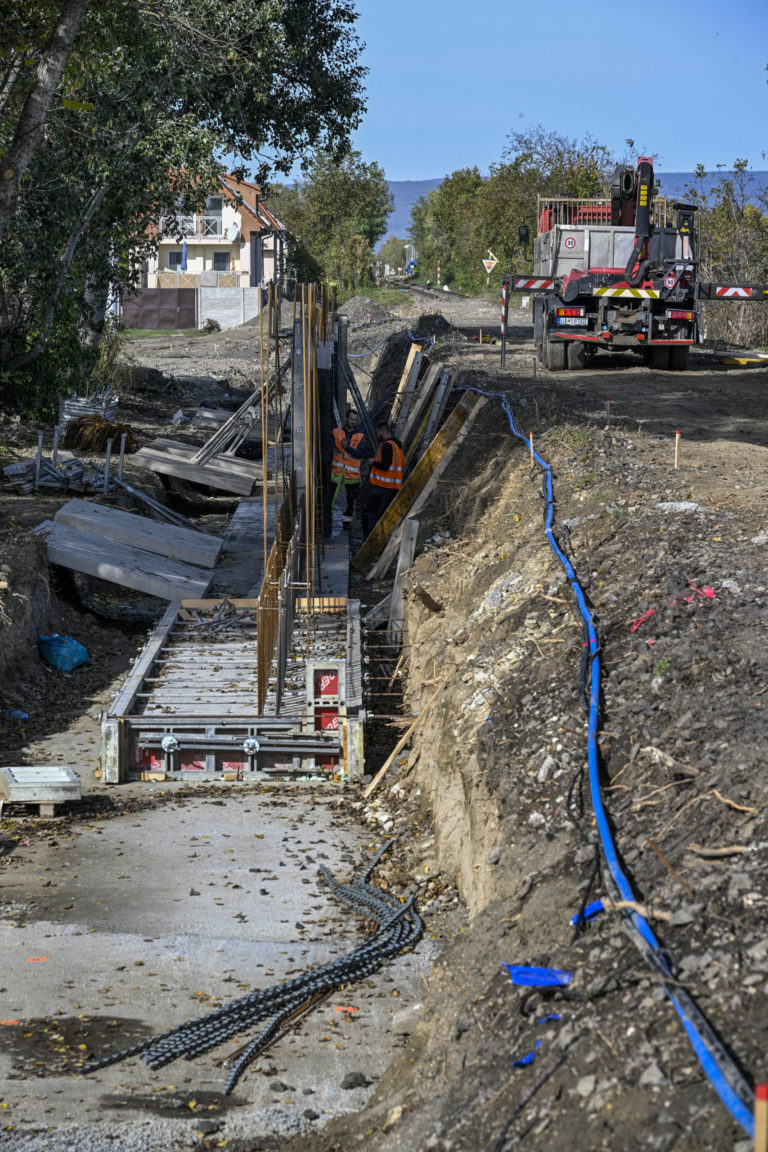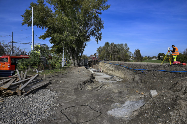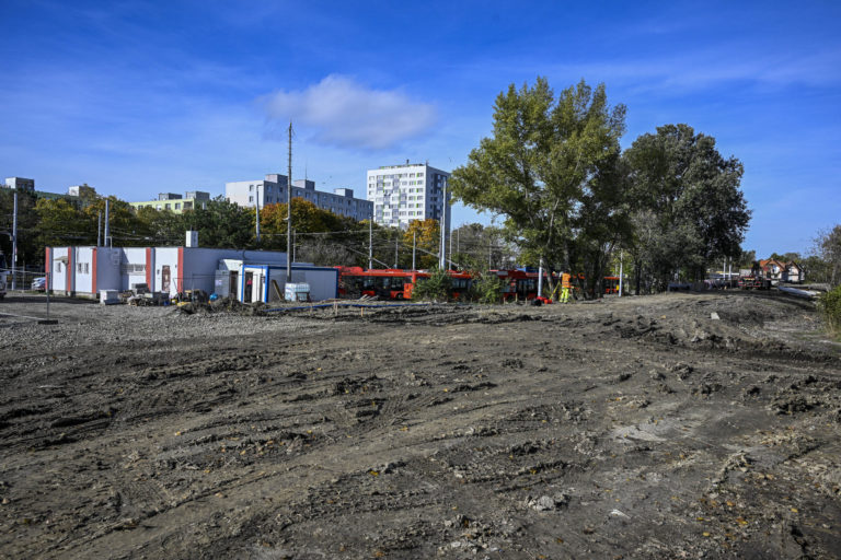 Výstavba terminálu integrovanej osobnej prepravy (TIOP), združenej zastávky pre vlak a MHD v bratislavskej mestskej časti Vrakuňa, ktorý nahradí súčasnú provizórnu zastávku na jednokoľajnej železničnej trati Bratislava - Dunajská Streda - Komárno. Práce by mali trvať do druhého kvartálu 2024. Bratislava, 30. október 2023. Foto: SITA/Milan Illík